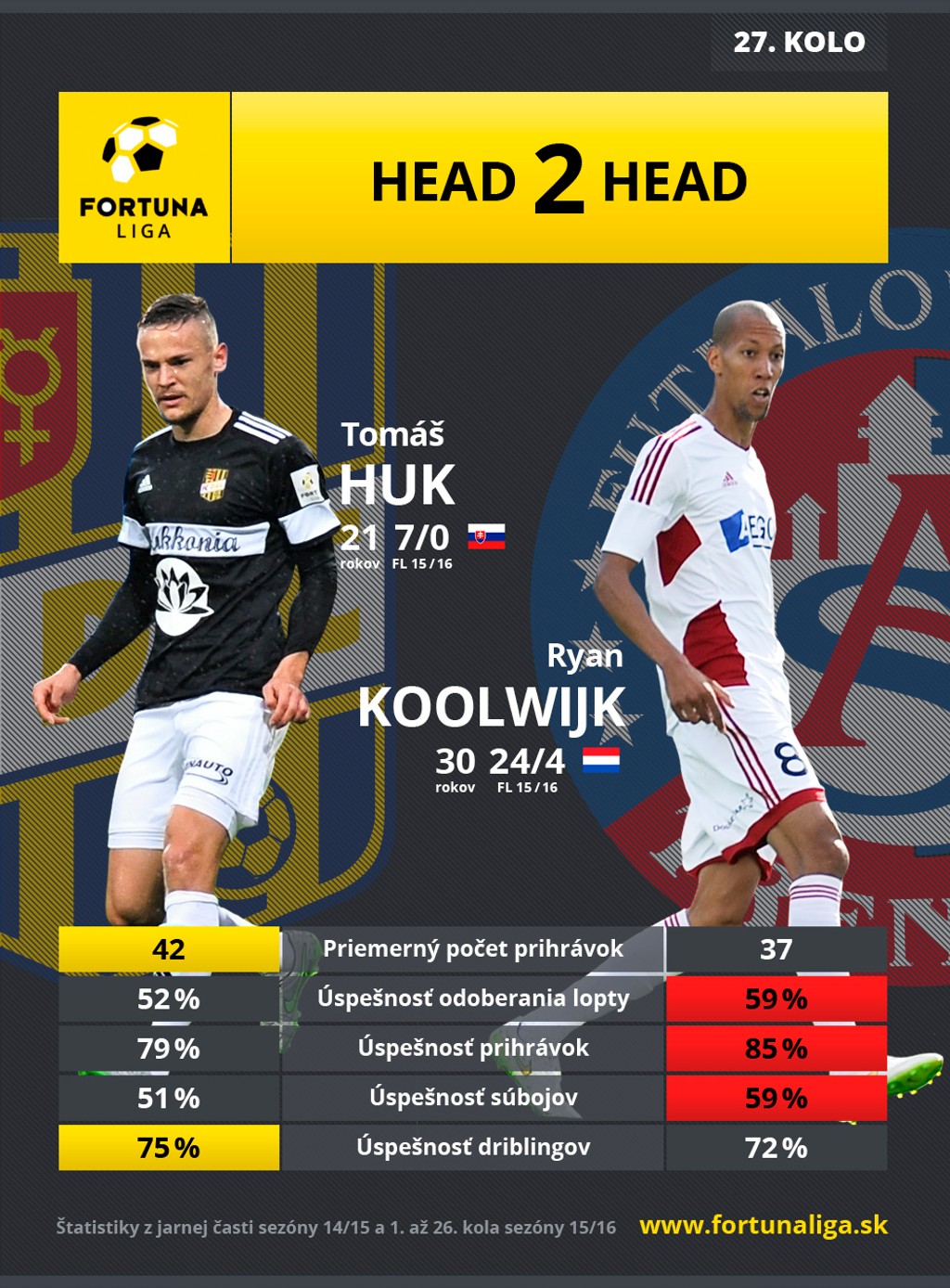 Boj o titul aj záchranu v slovenskej futbalovej Fortuna lige 2015/2016 pokračuje zápasmi 27. kola. Majster Trenčín bude hájiť 9-bodový náskok pred Slovanom Bratislava na pôde Dunajskej Stredy, "belasí" v nedeľu zakončia kolo duelom v Senici.