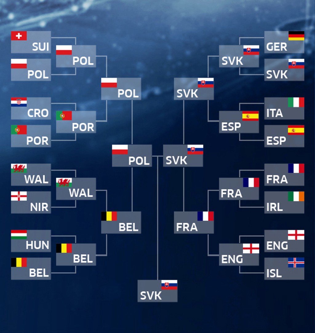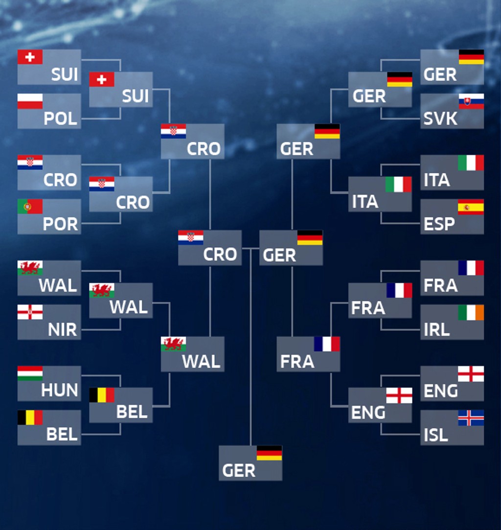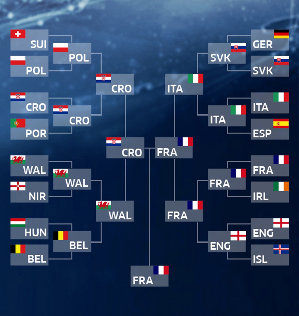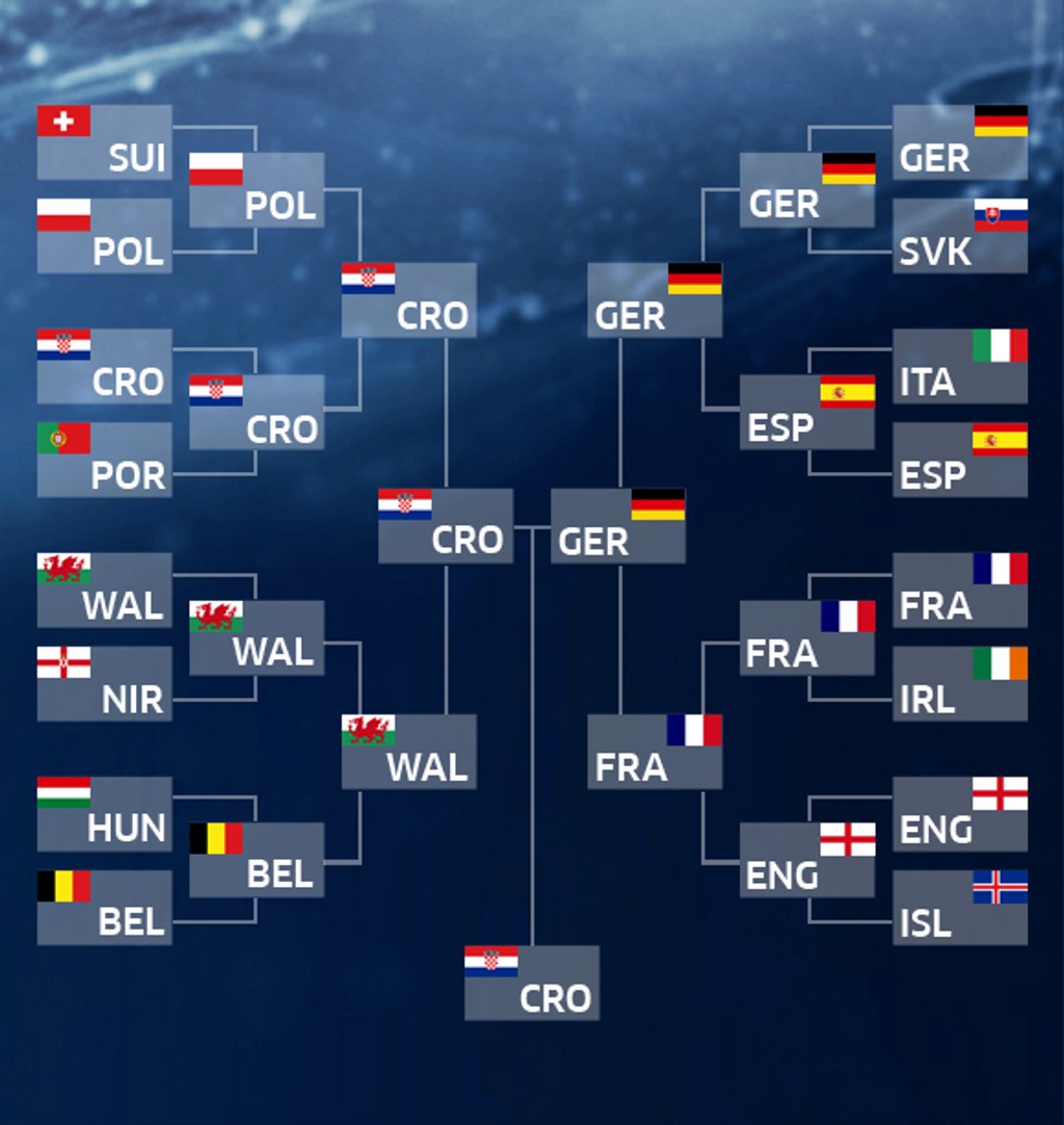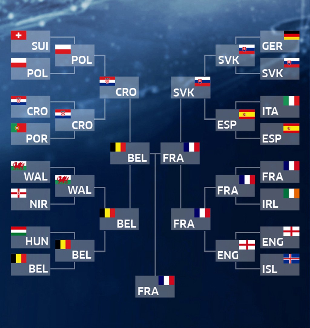 Vo štvrťfinále dajú Chorváti stopku Poliakom, Belgičania svoj výkon vystupňujú a zdolajú Wales, nad sily Talianov budú Nemci a spanilú jazdu Islandu ukončia domáci Francúzi. Tí však pred bránami finále stroskotajú na Nemcoch, ktorí sa vo finále stretnú s Belgickom. To po penaltách pokorí Chorvátsko.