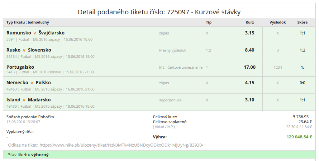 "Jeden náš tiper na Záhorí si tipol ešte pred mesiacom 5 zápasov, kde okrem iného si správne tipol aj výsledok Slovensko - Rusko, že vyhráme 2 :1," potvrdil riaditeľ pre kurzové stávky Richard Slušný.