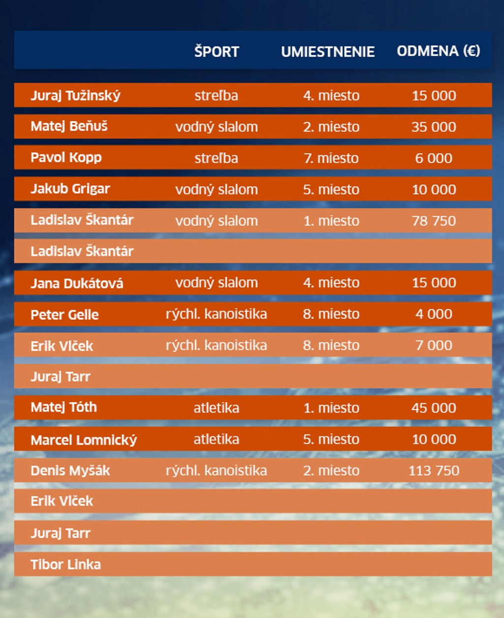 Zlatý medailista Matej Tóth dostane 45-tisíc eur, naproti tomu bratranci Škantárovci si rozdelia takmer 79-tisíc. Za striebro si Matej Beňuš pripíše na účet 35-tisíc eur, naši rýchlostní kanoisti z K4 si prilepšia o takmer 114-tisíc eur. Na hlavu tak každému pripadne asi 28-tisíc.