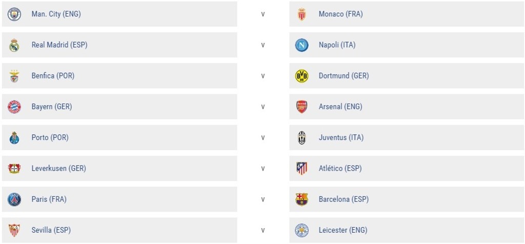 V osudí figurovalo okrem obhajcu trofeje Realu Madrid šesť bývalých šampiónov - FC Barcelona, Bayern Mníchov, Borussia Dortmund, FC Porto, Juventus Turín a Benfica Lisabon. Premiérovo sa do 16-finále prebojoval Leicester City, ktorý sa predstaví proti FC Sevilla. Najväčšie zastúpenie mal španielsky futbal, ktorý reprezentovalo kvarteto klubov (Real Madrid, FC Barcelona, Atletico Madrid, FC Sevilla). Tri mužstvá dodali Nemci (Bayern Mníchov, Borussia Dortmund, Bayer Leverkusen) a Angličania (Arsenal Londýn, Manchester City, Leicester City), dva boli z francúzskej Ligue 1 (Paríž Saint-Germain, AS Monaco), talianskej Serie A (SSC Neapol, Juventus Turín) a najvyššej portugalskej súťaže (FC Porto, Benfica Lisabon).