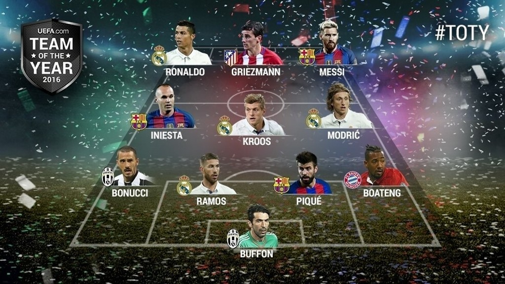 Európska futbalová únia (UEFA) zverejnila zostavu roka 2016, o ktorej prostredníctvom hlasovania rozhodli fanúšikovia. Najpočetnejšie zastúpenie má v nej madridský Real (4 hráči), troch futbalistov má v ideálnej zostave konkurenčná Barcelona.