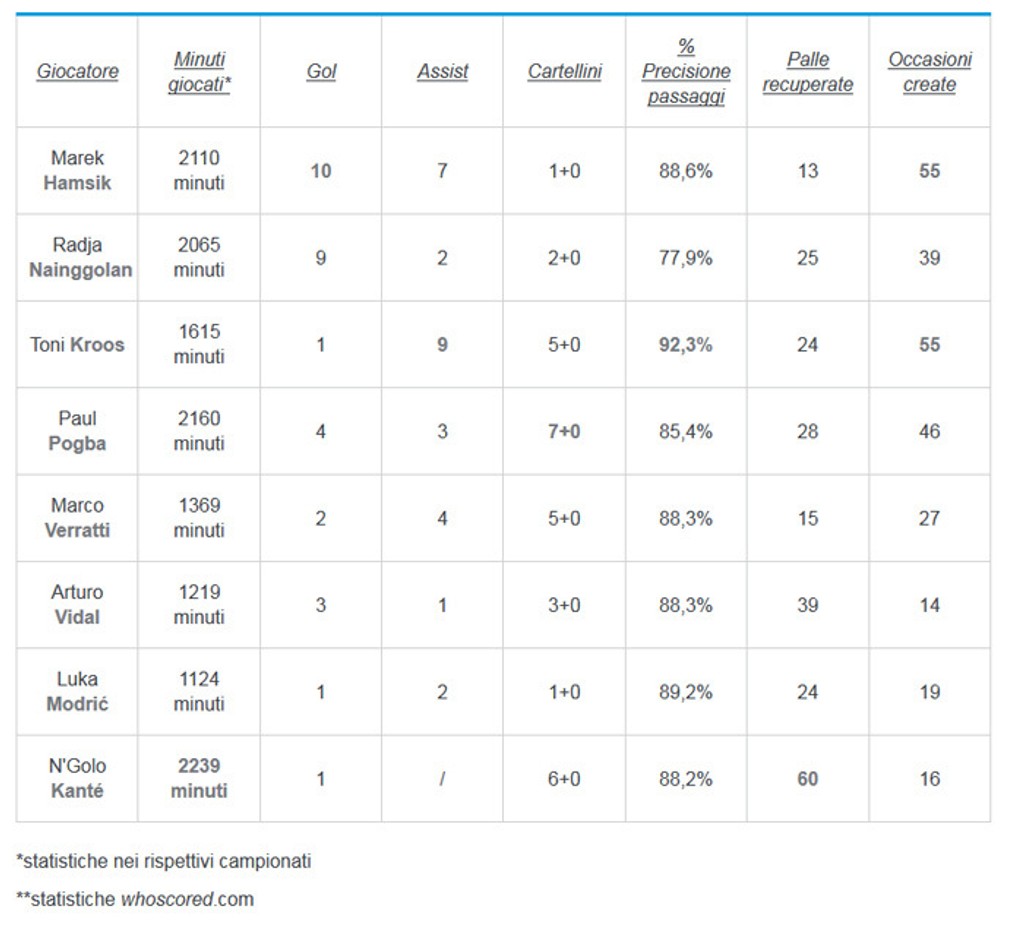 Experti sa zamerali na tieto štatistiky: počet odohraných minút, góly, asistencie, úspešnosť prihrávok a získané lopty. Hamšíkovi zaistila prvenstvo najmä jeho strelecká potencia a tvorivosť, keď počas 2110 minút strávených na trávniku zaznamenal 10 gólov, sedem asistencií a vytvoril 55 šancí pre spoluhráčov.