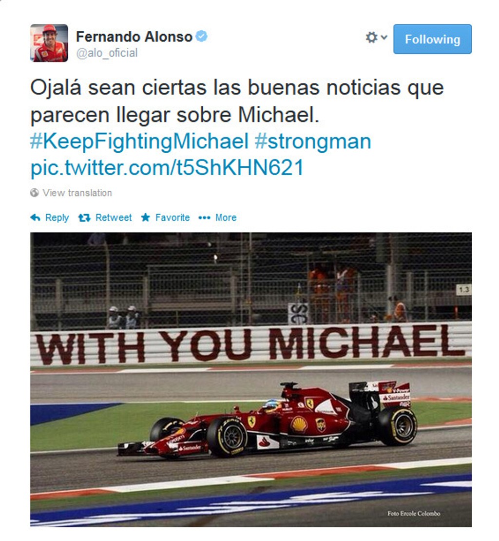 Deň po pozitívnej správe o zlepšenom zdravotnom stave Michaela Schumachera sa jeho bývalý rival Španiel Fernando Alonso nechal odfotografovať pri svojom monoposte s transparentom "Sme s Tebou Michael". Stalo sa tak po tréningu na Veľkú cenu Bahrajnu v Sakhire.
