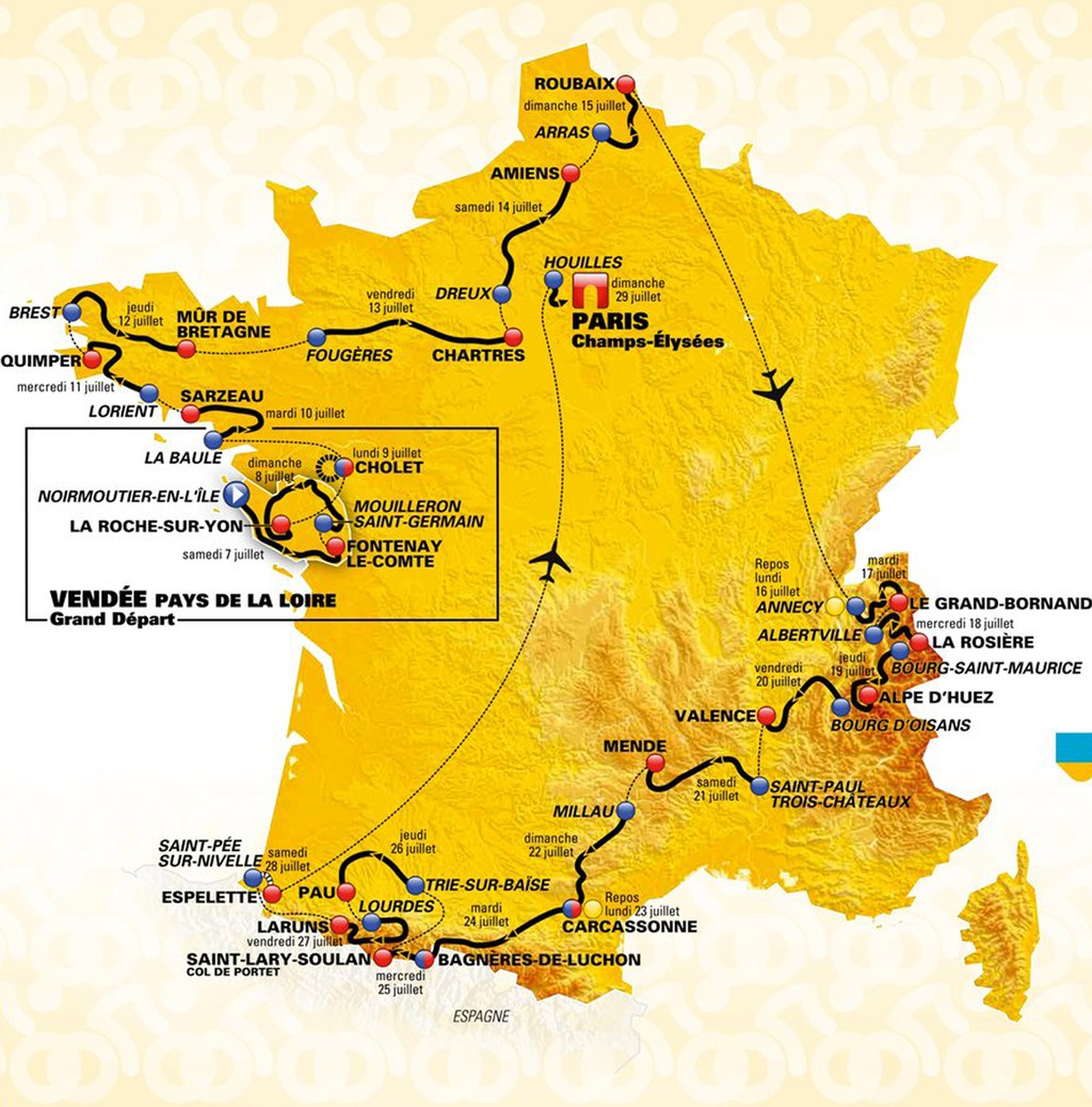 Z 21 etáp budú dve časovky, tímová sa pôjde v tretej etape a individuálna kopcovitá na 31 kilometrov v poslednú sobotu. Preteky sú geograficky rozdelené na severnú a južnú časť, jazdcov zavedú na mačacie hlavy klasiky Paríž - Roubaix či na vrchol L'Alpe d'Huez. Pelotón absolvuje dva letecké presuny. Informoval o tom portál cyclingnews.com.