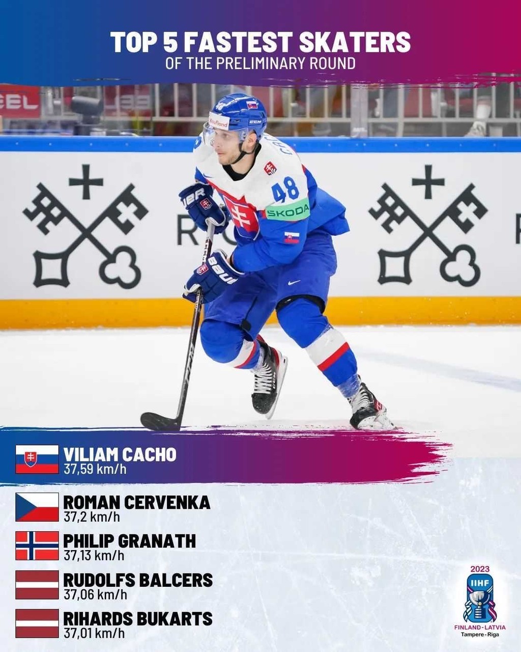 Podľa IIHF 24-ročný Trenčan po piatich hracích dňoch so „šprintom“ 37,59 km/h kraľuje rebríčku najrýchlejších korčuliarov 86. majstrovstiev sveta.