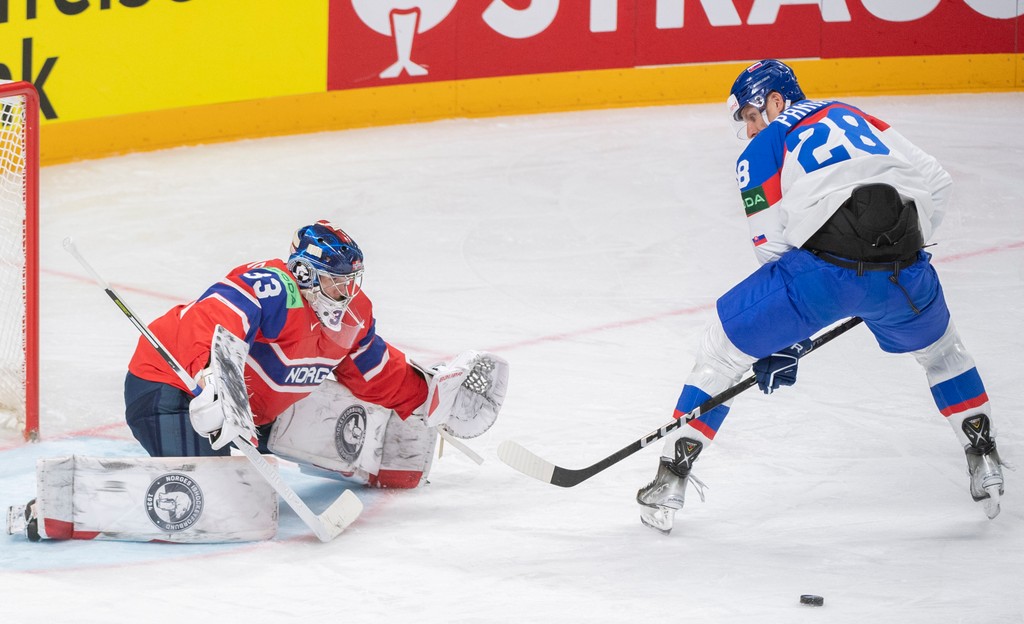 V 35. minúte Viliam Čacho výborne vypálil švihom, gólman Haukeland vyrazil pred Mária Luntera, no ten sa zle zorientoval a nezasúval puk do poloprázdnej bránky.