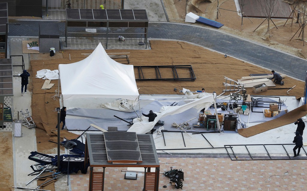 Prudké nárazy vetra riadne komplikovali situáciu aj v mediálnej dedine, kde na jednom zo vstupov rozmlátilo prístupový bezpečnostný skener a povetrím lietala všadeprítomná hlina. Problémy sa nevyhli ani obchodu so suvenírmi, vietor poškodil jeho strop. Improvizovaný obchod je rovnako ako tlačové centrá skonštruovaný iba z oceľových rúr a celtoviny.