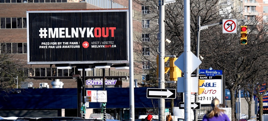 Nahnevaní fanúšikovia klubu zámorskej hokejovej NHL Ottawa Senators žiadajú odchod majiteľa Eugenea Melnyka. V štyroch rôznych štvrtiach kanadskej metropoly nechali na vlastné náklady umiestniť štyri veľké billboardy s nápisom #MelnykOut.