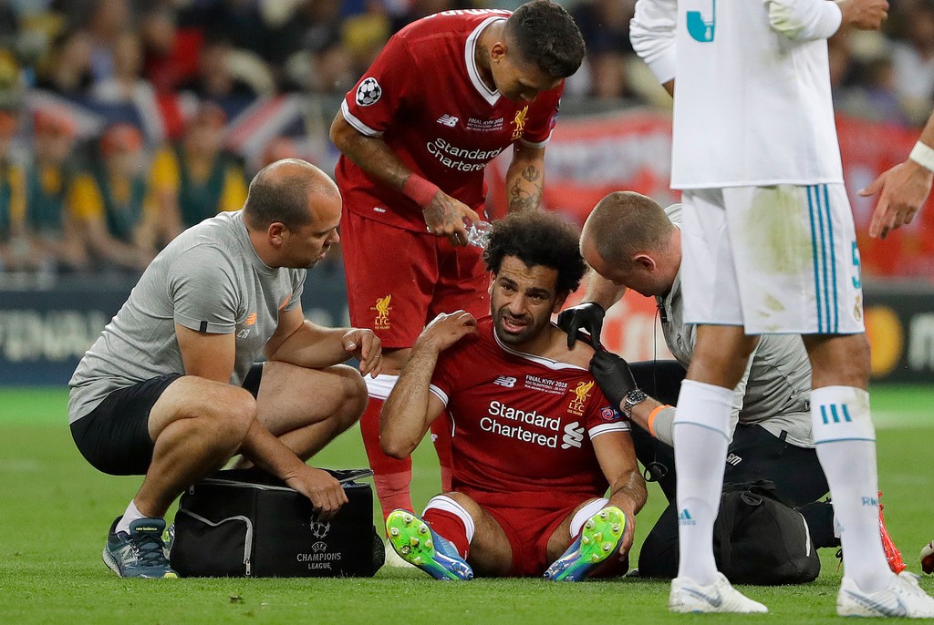 Obrovskú smolu mal Salah, ktorý s vykĺbeným ramenom musel po polhodine odstúpiť z hry a na ihrisku ho nahradil Lallana. O päť minút neskôr ho na opačnej strane barikády nasledoval do útrob štadióna so slzami v očiach pravý obranca Carvajal, ktorého zradil členok. V 43. minúte mohol Real po hluchej pasáži nečakane udrieť. Hlavičku Ronalda však reflexívne na čiare vyrazil Karius a Benzemu z následnej dorážky síce rozvlnil sieť, ale srbský rozhodca Mažič gól pre ofsajd neuznal.