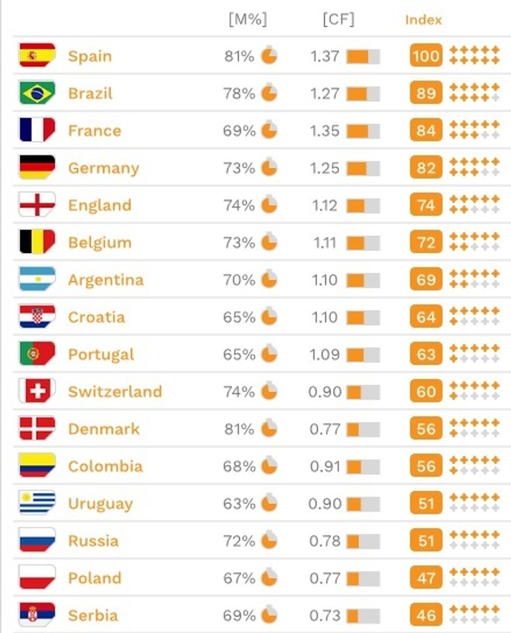 Takzvaný "power index" je kombináciou priemerného percenta zápasov odohraných v ligovej súťaži od júla minulého roka v podaní 23 najlepších hráčov v kvalifikácii s priemernou športovou úrovňou svojich tímov. To ako najhorúcejšieho víťaza mundialu v Rusku určilo majstrov sveta z roku 2010 Španielov. Druhé miesto obsadila Brazília.