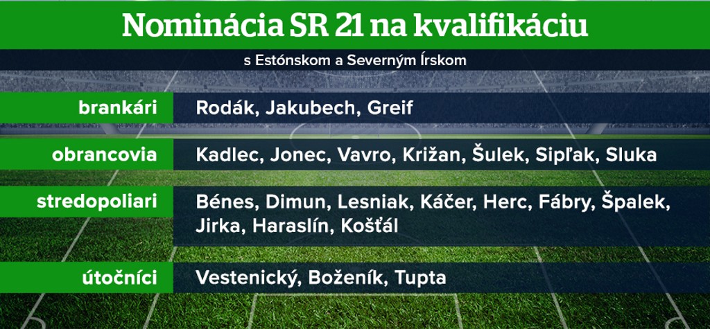 Brankári: Marek Rodák (Rotherham United FC), Adam Jakubech (OSC Lille), Dominik Greif (ŠK Slovan Bratislava)