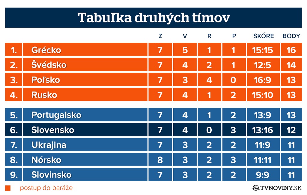 V 6. skupine sa bude v priamej konfrontácii bojovať o prvenstvo medzi Švédskom a Belgickom. To za žiadnych okolností nemôže skončiť v poradí druhých tímov za Slovenskom, no Švédsku by po prehre zostalo iba štrnásť bodov.