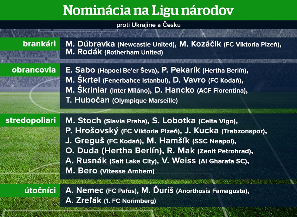 V prvej nominácii nového trénera slovenskej futbalovej reprezentácie Pavla Hapala na zápasy Ligy národov proti Ukrajine (16. novembra o 20.45 h v Trnave) a v Česku (19. novembra o 20.45 v Prahe) figuruje aj stredopoliar Miroslav Stoch. Hráč Slavie Praha sa do národného mužstva vráti prvýkrát od EURO 2016 vo Francúzsku.