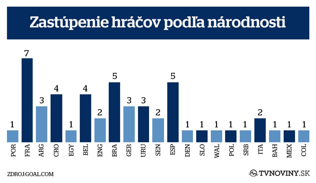 Slovenský futbal v rebríčku zastúpenie nemá, až sedmičku hráčov tvoria francúzski hráči (K. Mbappé, R. Varane, A. Griezmann, N. Kanté, P. Pogba, S. Umtiti, F. Thauvin), nasledujú piati Brazílčania (Marcelo, P. Coutinho, Alisson, Neymar, R. Firmino) a Španieli (Isco, S. Ramos, D. De Gea, D. Silva, A. Iniesta).