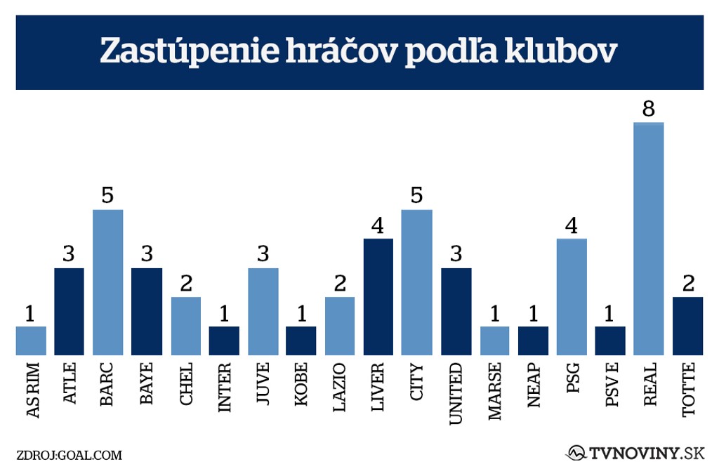 Po štyroch zástupcoch majú belgický (K. De Bruyne, E. Hazard, T. Courtois, R. Lukaku) a chorvátsky futbal (L. Modrič, I. Perišič, I. Rakitič, M. Mandžukič), po troch má Argentína (L. Messi, S. Agüero, P. Dybala), Nemecko (T. Kroos, L. Sané, J. Kimmich) a Uruguaj (L. Suárez, D. Godín, E. Cavani).
