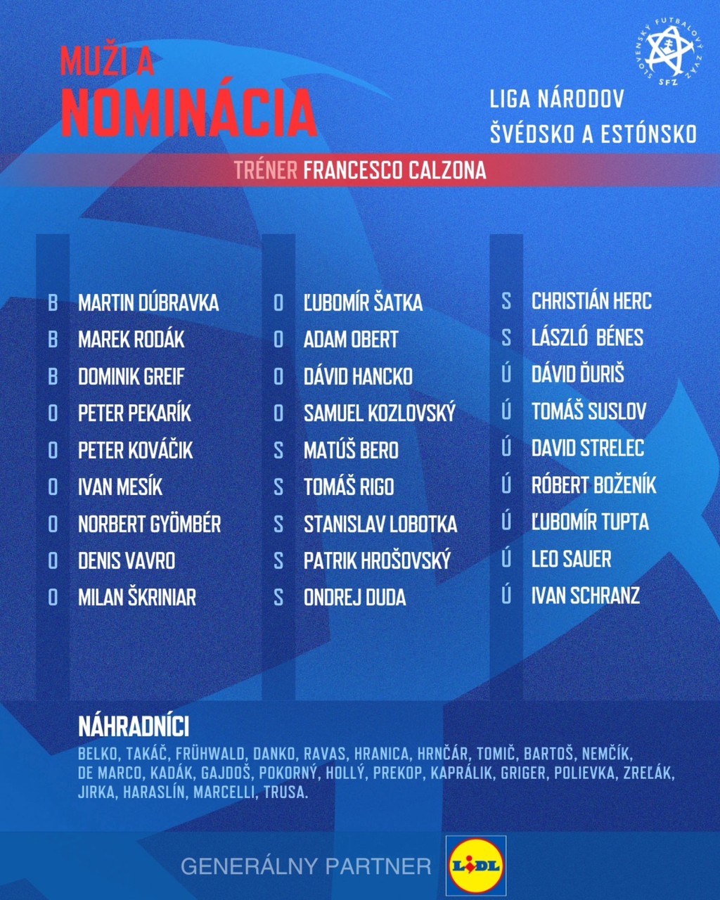 V nominácii slovenskej futbalovej reprezentácie na novembrové zápasy Ligy národov figuruje napriek zraneniu stehna Stanislav Lobotka. Prvýkrát pod trénerom Francescom Calzonom bude s národným tímom brankár Dominik Greif a po zranení sa vrátil jeden z najlepších strelcov ME 2024 Ivan Schranz. Premiérovo sa dostal do nominácie 22-ročný obranca Peter Kováčik.