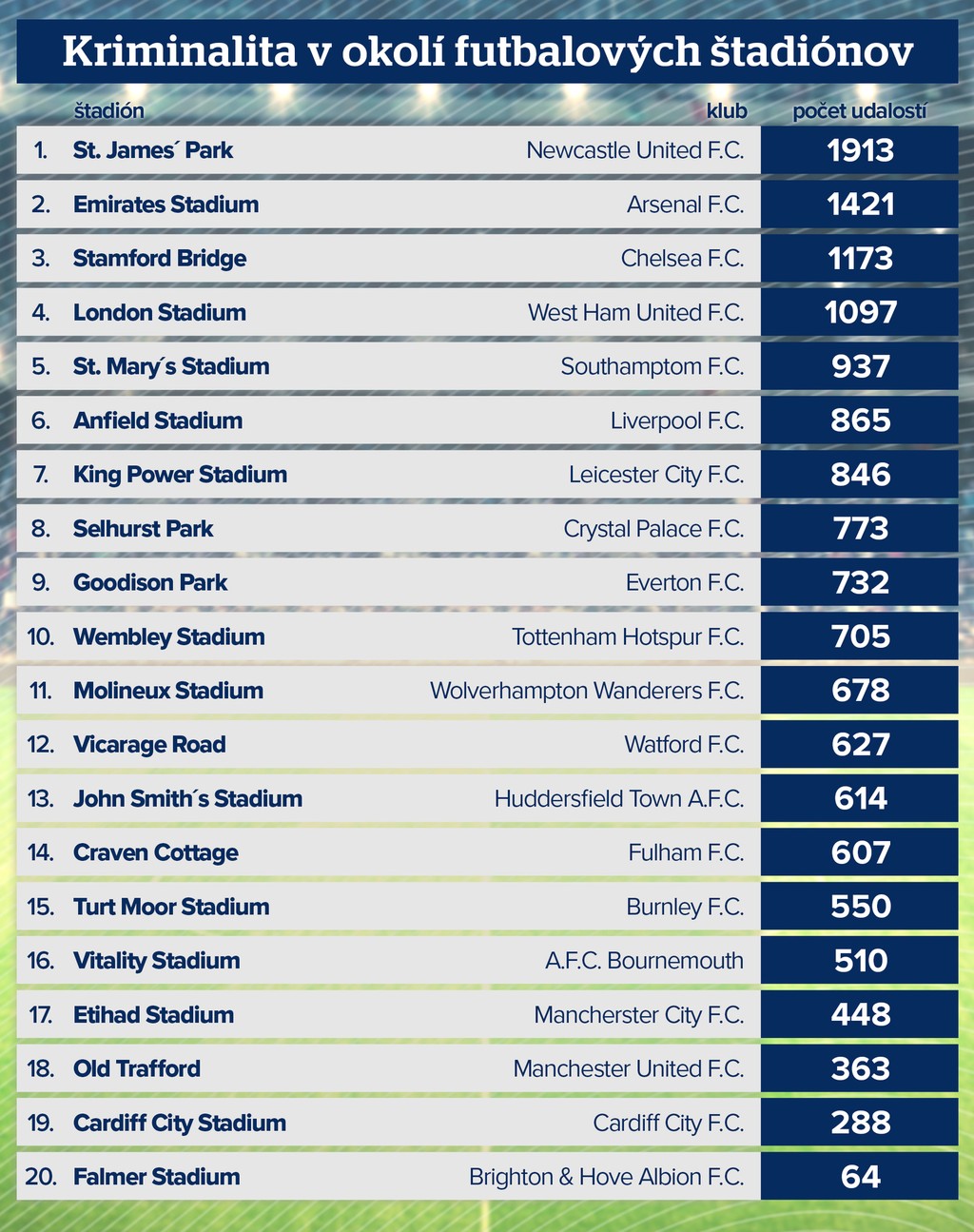 V prieskume sa zamerala na bezpečnosť na štadiónoch a v okruhu jednej míle (1,6 km) okolo nich. Tabuľka vznikla na základe údajov za mesiac november 2018.