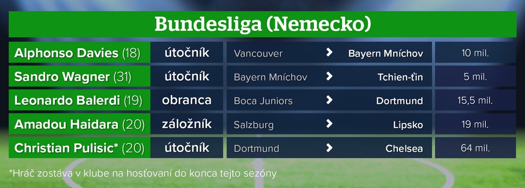 Mnichovský Bayern síce stratil zakončovateľa Sandra Wagnera, ktorého zlákala Čína, Bavori však z americkej súťaže ulovili vychádzajúcu kanadskú hviezdičku - 18-ročného Alphonsa Daviesa. Lipsko potvrdilo príchod mladého malijského záložníka Amadoua Haidaru zo Salzburgu.