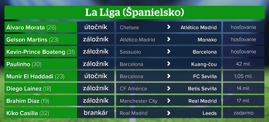 Madridské Atlético uvoľnilo na hosťovanie do Monaka portugalského záložníka Gelsona Martinsa, útočné rady ale vystužil Álvaro Morata z Chelsea. Zaujal aj 14-miliónový presun mexického tínedžera Diega Laineza do Betisu Sevilla.