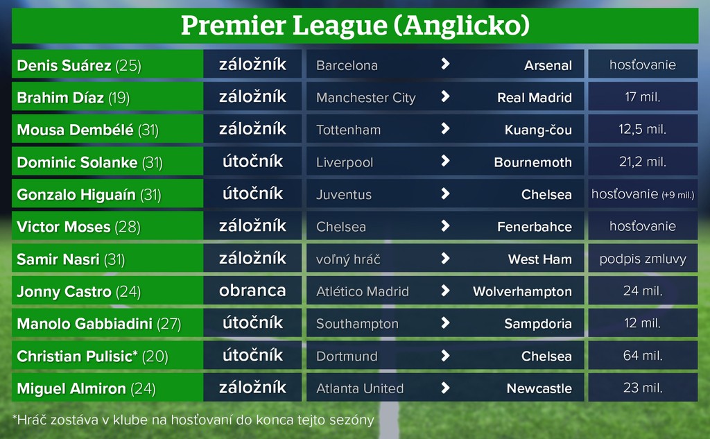 West Ham sa dohodol na spolupráci so Samirom Nasrim, z Chelsea do tureckého Fenerbahce odišiel Victor Moses. Za 24 miliónov eur Wolverhampton získal obrancu Jonnyho Castra.