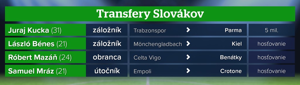 Počas zimnej prestávky zmenili pôsobisko aj štyria členovia reprezentácie. Juraj Kucka sa vrátil do talianskej súťaže, za päť miliónov eur ho z tureckého Trabzonsporu kúpila Parma.