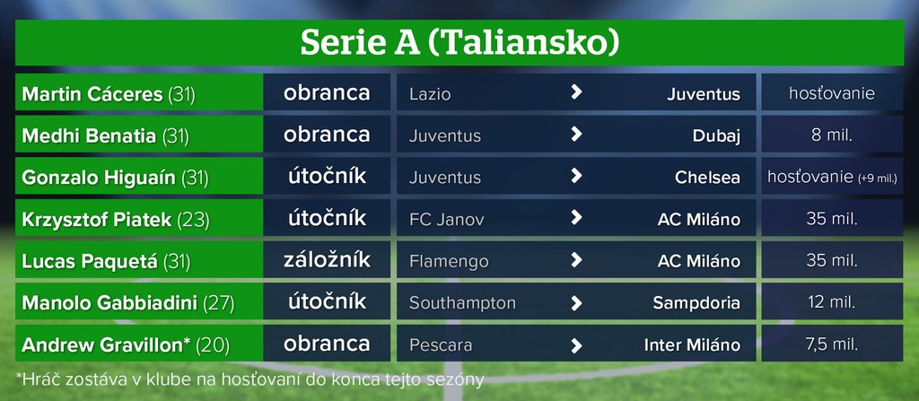 Najaktívnejším bolo milánske AC, ktoré zhodne po 35 miliónov eur uhradilo za poľského útočníka Krzysztofa Piateka a brazílskeho záložníka Lucasa Paquetú.