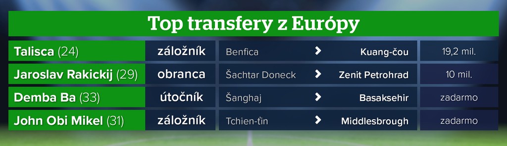 Mimo top líg zaujal odchod ďalšieho hráča do najľudnatejšej krajiny sveta. Záložník Talisca odišiel z portugalskej Benficy Lisabon. Ruský Zenit Petrohrad dotiahol príchod obrancu Jaroslava Rakického zo Šachtaru.