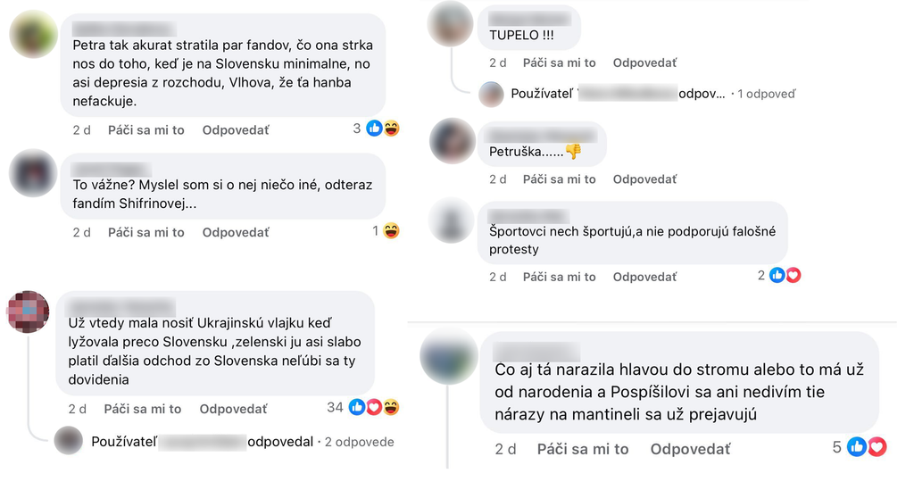 „Ako športovkyňa super, ale nevieš, čo robíš na Slovensku. Aj ty potrebuješ mizernú tisícku ako Polívka,“ prirovnal ju komentujúci k slávnemu českému hercovi Bolkovi Polívkovi, ktorý podporil protesty v Bratislave.