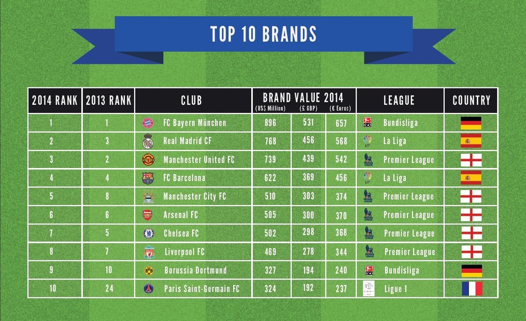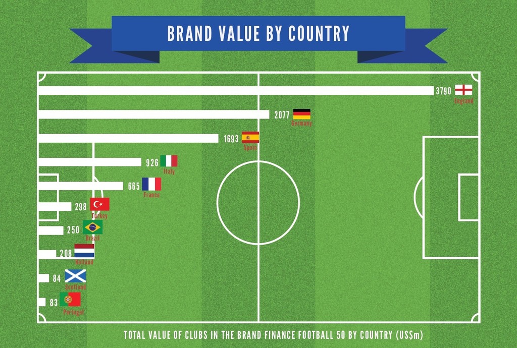 V rebríčku TOP 50 najcennejších klubových značiek sa najčastejšie vyskytujú tímy z britských ostrovov, majú v ňom až 16 zástupcov. Druhou najzastúpenejšou krajinou je Nemecko s ôsmimi klubmi. Taliansko má v rebríčku šesť tímov, Španielsko a Francúzsko po päť, Brazília štyri, Turecko tri a Portugalsko jeden.