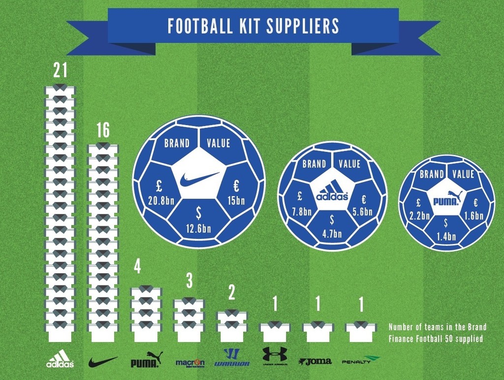 Z najdrahšej päťdesiatky klubov hráva až 21družstiev v dresoch od firmy Adidas. Na druhom mieste je firma Nike, ktorej dresy oblieka 16 tímov.