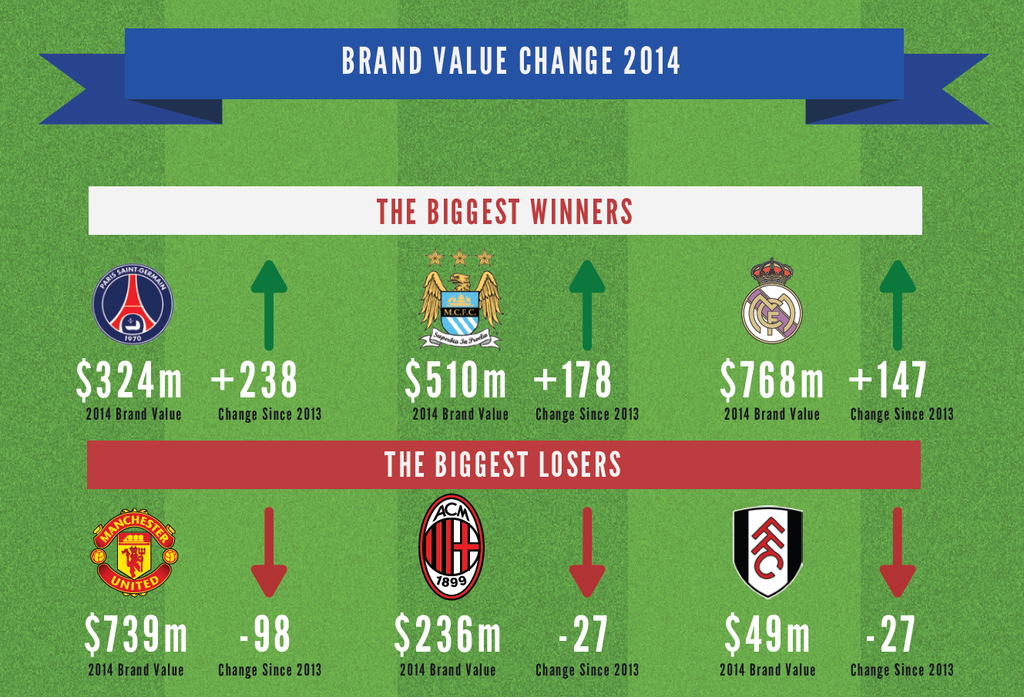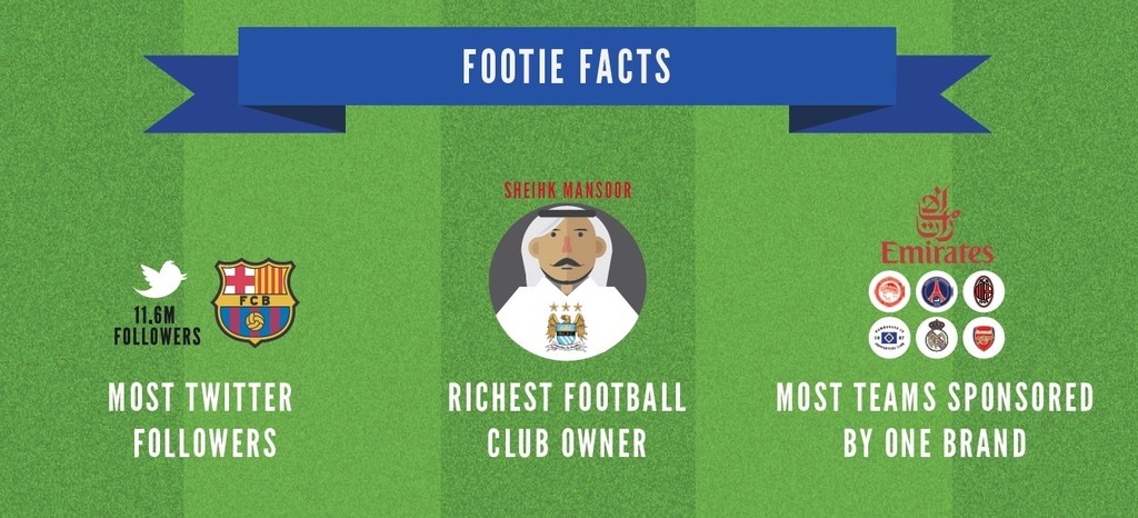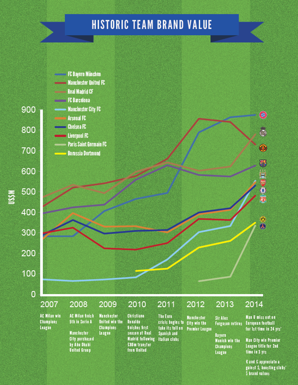 Brand Finance vydali okrem rebríčku hodnoty značiek aj viaceré zaujímavé fakty. FC Barcelona je najsilnejší klub na sociálnych sieťach, majiteľ Manchestru City Šejk Mansoor je najbohatší vlastník futbalového klubu a letecká spoločnosť Emirates sponzoruje najviac futbalových tímov (Olympiacos Pireus, PSG, AC Miláno, Arsenal Londýn, Hamburger SV a Real Madrid)