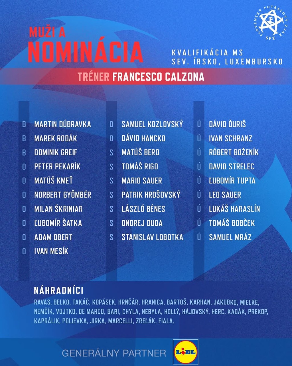 V nominácii slovenskej futbalovej reprezentácie na októbrové zápasy kvalifikácie MS figurujú obaja bratia Sauerovci. Už stabilného člena A-tímu Lea Sauera doplní vo výbere Francesca Calzonu pred zápasmi v Severnom Írsku a s Luxemburskom jeho starší brat Mário Sauer. Ten si vypýtal pozvánku výkonmi v novom pôsobisku, vo francúzskom FC Toulouse. V kádri okrem tradičných opôr nechýba ani brankár Dominik Greif, ktorému sa darí po prestupe do Olympique Lyon.