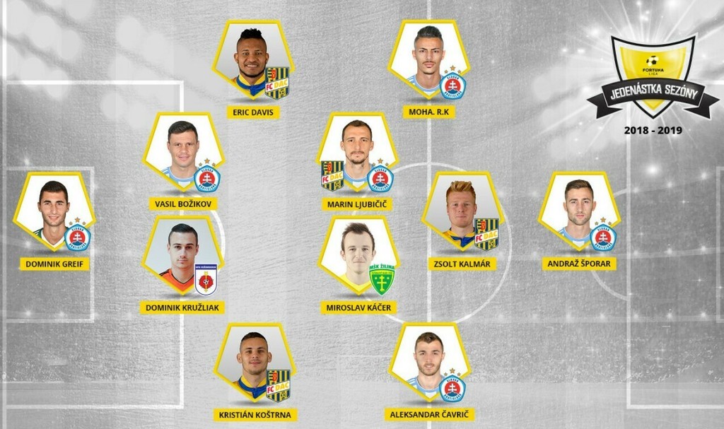 Historická sezóna v podaní klubu zo Žitného ostrova sa premietla do nominácie pre trio Dunajskostredčanov. Ocenenie z mužstva vicemajstra získali krajní obrancovia Kristián Koštrna a Eric Davis aj ofenzívny stredopoliar Zsolt Kalmár. Jedenástku doplnili dvaja slovenskí reprezentanti do 21 rokov, ktorí si napriek mladému veku vo svojich kluboch už natiahli na rukáv kapitánsku pásku, obranca bronzového Ružomberka Dominik Kružliak a stredopoliar Žiliny Miroslav Káčer.