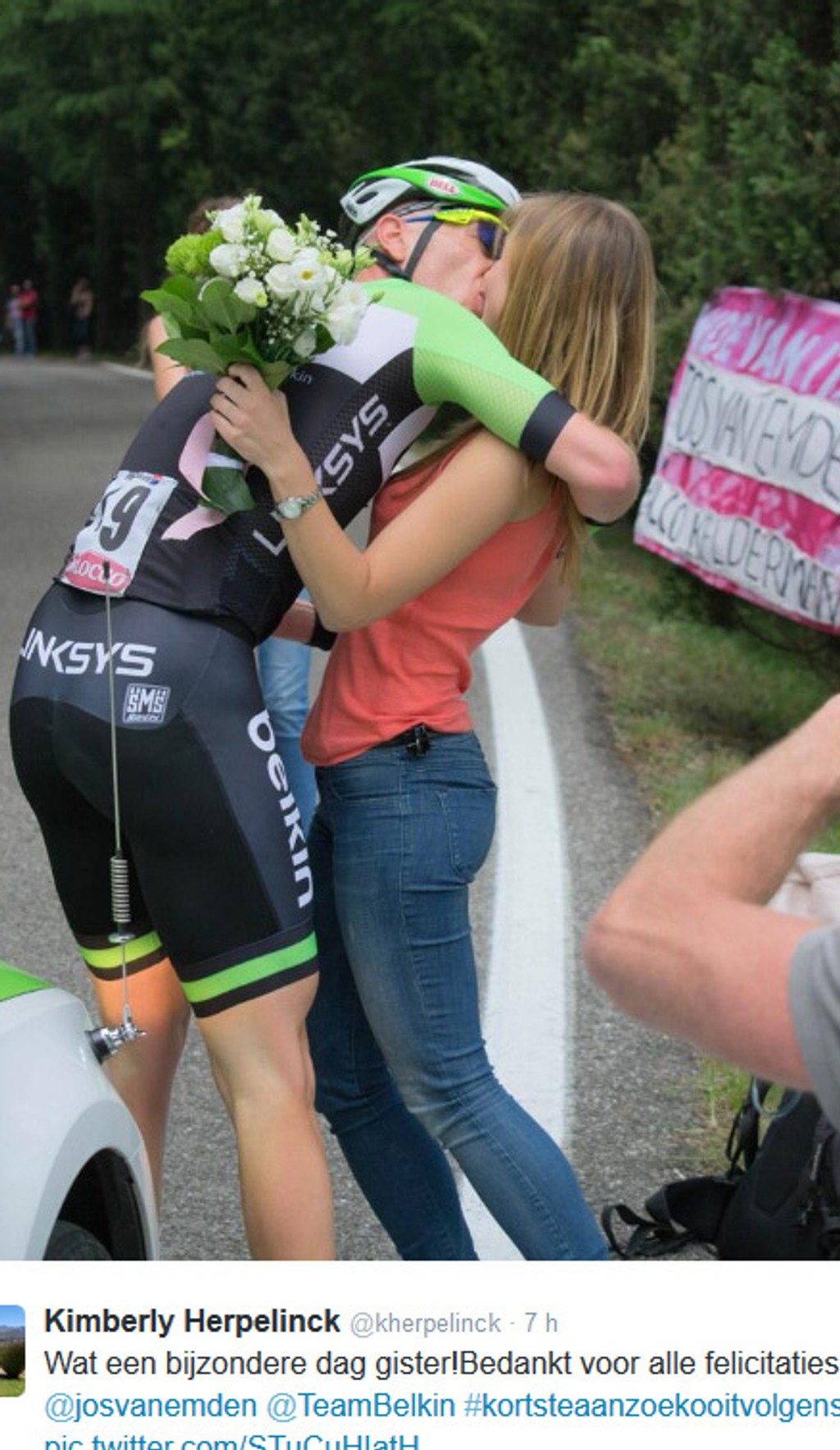 "Jazdec tímu Belkin zastavil počas záverečného stúpania na Cima Grappa pri krajnici a svoju priateľku požiadal o ruku. Kimberley Herpelincková odpovedala: Áno," informuje agentúra dpa.