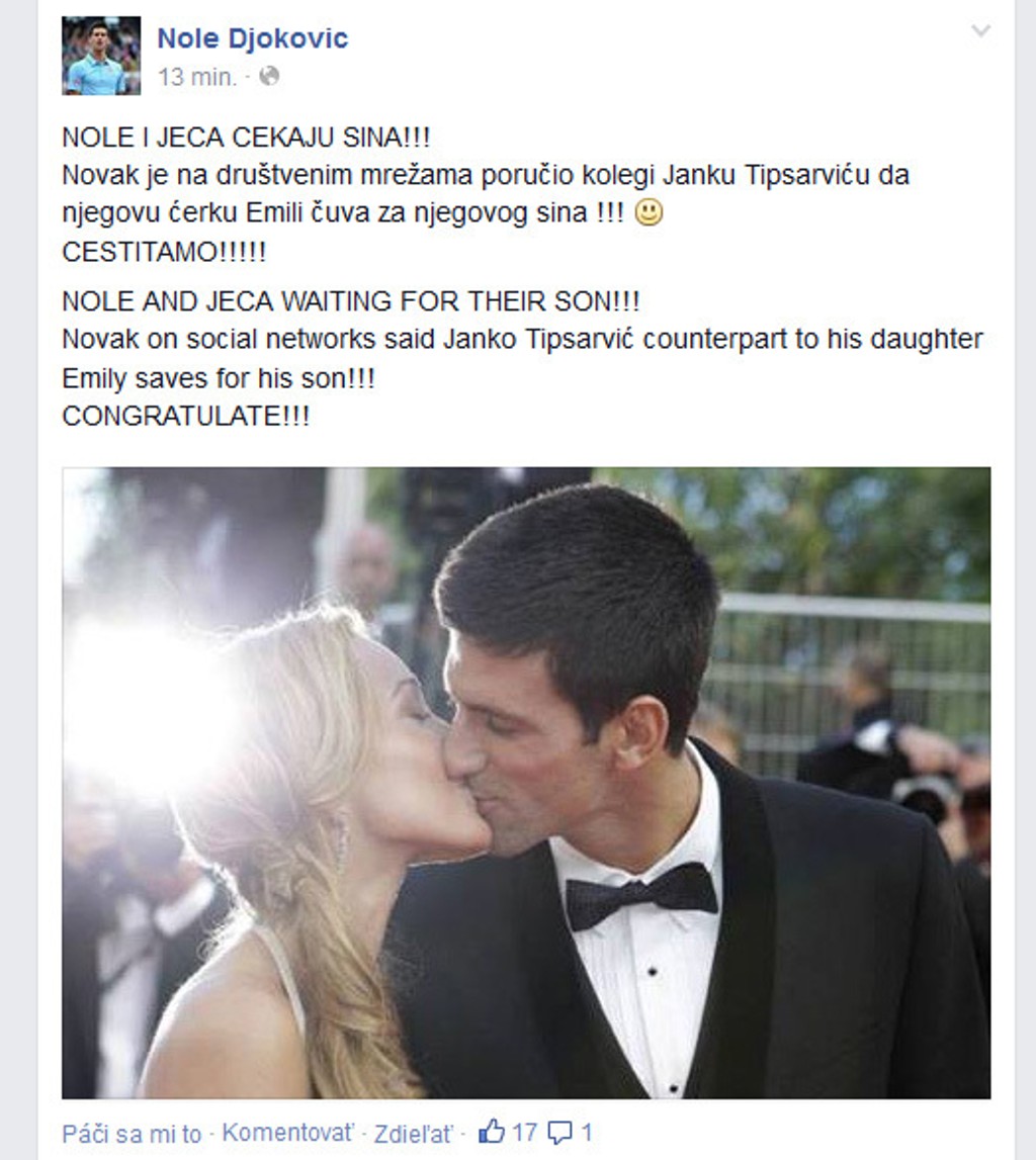 Srbský tenista Novak Djokovič už vie, či bude mať syna alebo dcéru. A ako to inak v jeho prípade býva, podelil sa o svoju radosť na sociálne sieti. Jeho prvorodeným dieťaťom bude syn, ktorého mu porodí priateľka Jelena.