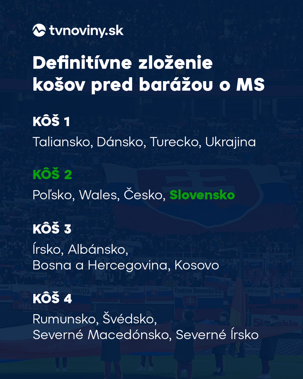 Možnými súpermi v prvom kole baráže tak pre Slovensko sú Írsko, Albánsko, Bosna a Hercegovina alebo Kosovo.