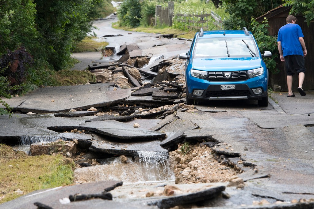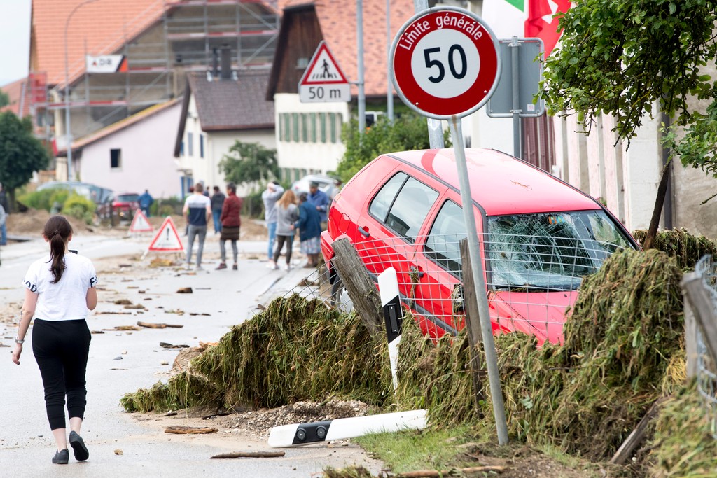 Vo švajčiarskom kantóne Neuchâtel sa vylial z brehov potok medzi osadami Dombresson a Villiers, pričom prúd strhol niekoľko desiatok automobilov. Viacero ľudí zostalo uviaznutých vo svojich vozidlách, kde museli čakať na vyslobodenie.
