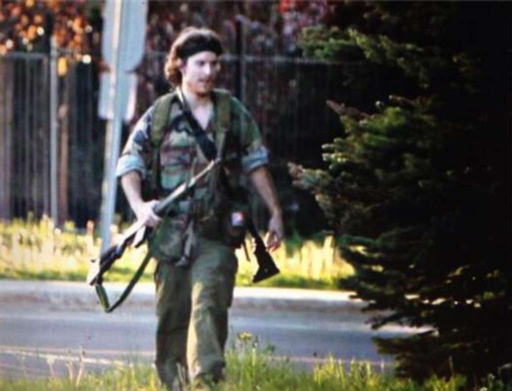 Kráčal ulicami mesta s dvoma puškami, oblečený v maskáčoch.