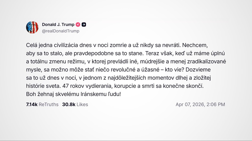 Americký prezident zverejnil desivý status. Napísal, že celá jedna civilizácia v noci z utorka na stredu zomrie, ak Irán neotvorí Hormuzský preliv.