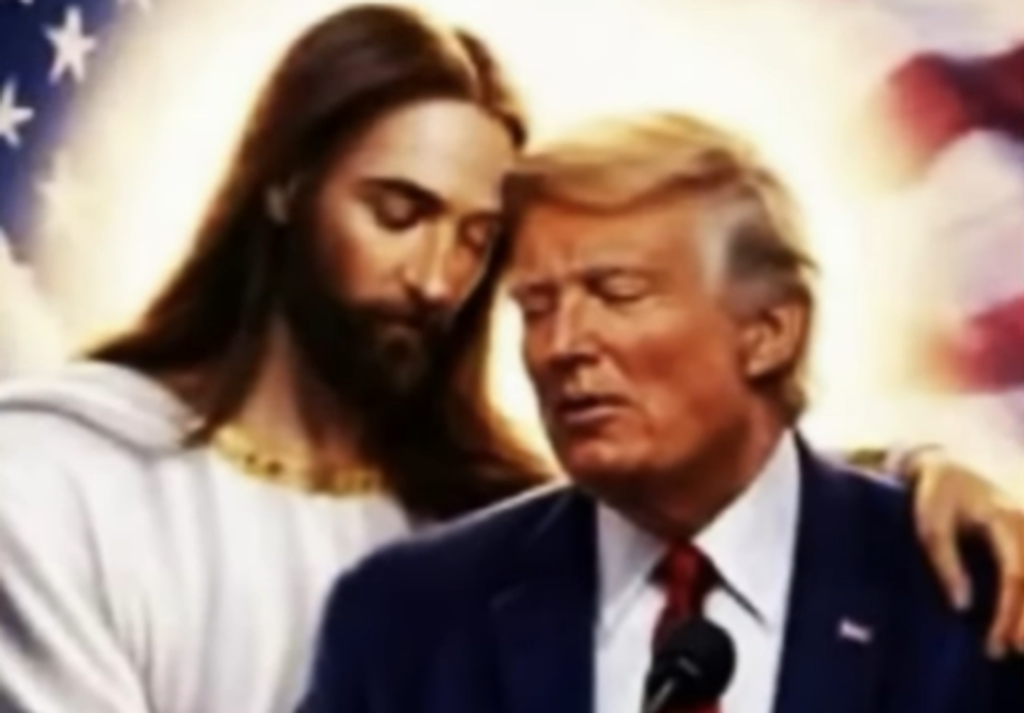 Digitálne upravený obrázok zverejnený na sieti Truth Social zachytáva Trumpa so zatvorenými očami v pomerne intímnej póze - Ježiš stojí za ním, pričom ho ľavou rukou objíma okolo pliec a pravú má na Trumpovej hrudi. Obe postavy majú hlavy naklonené k sebe a zatvorené oči, čo pôsobí dojmom duchovného alebo emotívneho spojenia. Pred Trumpom je mikrofón a v pozadí americká vlajka.