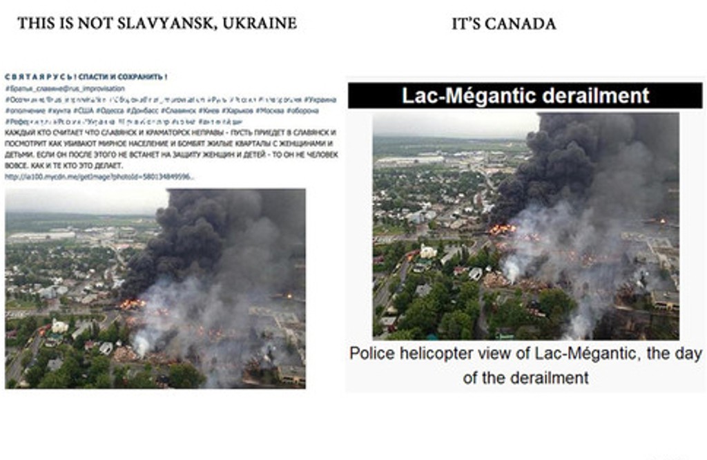 Ani táto fotografii nie je z mesta Slovjansk na Ukrajine. Je to vykoľajený vlak v kanadskom Quebecku.