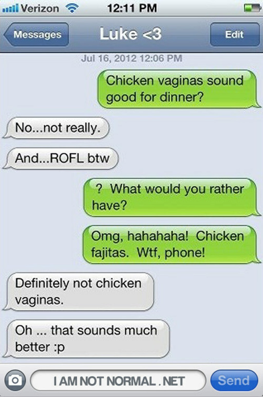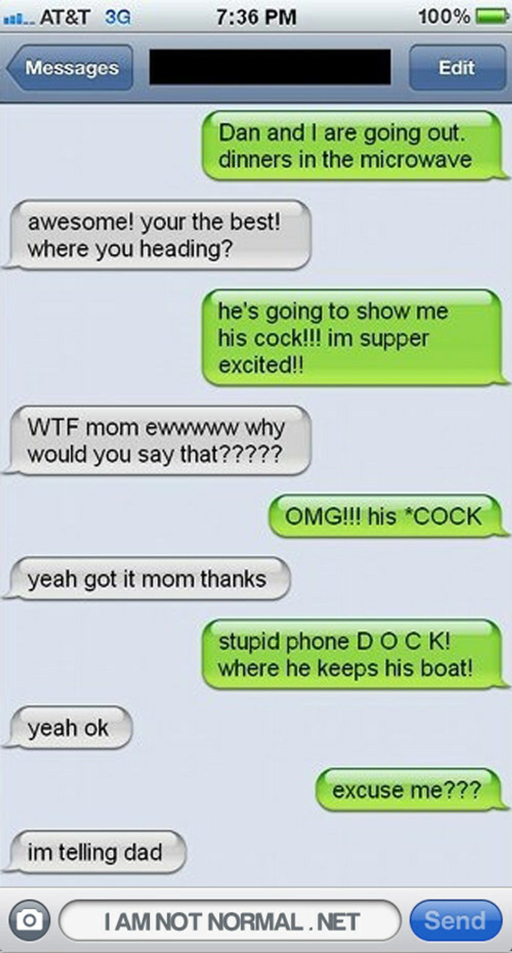 Na tento trapas istá mama nezabudne. Dcére poslala sms správu, že ide s Danom von a večeru má v mikrovlnke. Dcéra jej odpísala, že je najlepšia mama a opýtala sa, kam idú. Mama odpísala, že jej Dan chce ukázať jeho cock (penis) a že sa veľmi teší. Dcéra ostala zhrozená, našťastie jej mama objasnila, že jej má ukázať dock (miesto, kde kotví jeho loď).