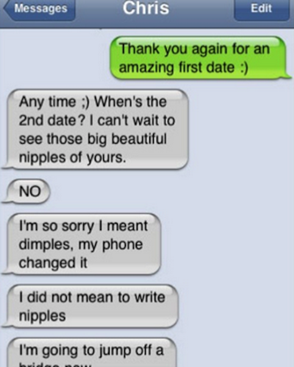 Mužovi prisla správa s poďakovaním za úžasné prvé rande. U dievčaťa chcel zabodovať lichôtkou, ako sa teší, že opäť uvidí jej jamky v lícach. Ale slovo dimples mu telefón opravil na nipples, čo znamená bradavky.