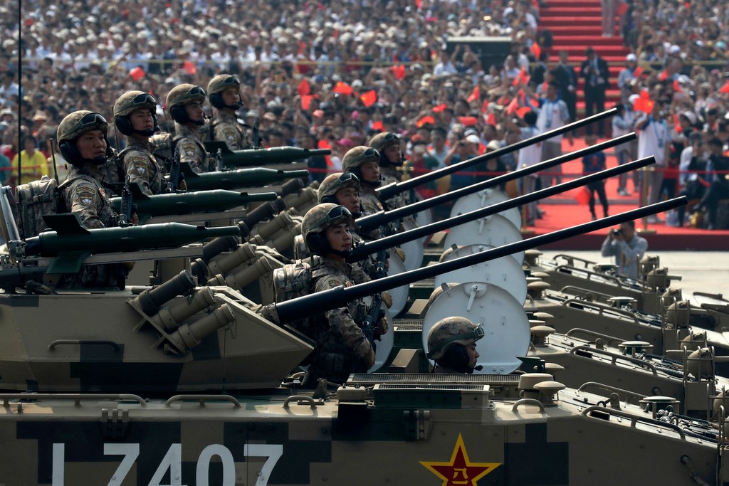 Sprievod sleduje z Brány nebeského pokoja čínsky prezident Si Ťin-pching spoločne so svojimi predchodcami v úrade, exprezidentmi Chu Ťin-tchaom a Ťiang Ce-minom.