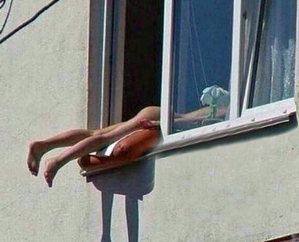 Mladá žena z Viedne sa rozhodla opaľovať kurióznym spôsobom. Nahá si ľahla do okna na treťom poschodí. Trčali jej len nohy a zadok. Mobilným telefónom ju zachytil študent Gregory Shakaki. "Keď som ju uvidel, myslel som si, že mám asi úpal," povedal.