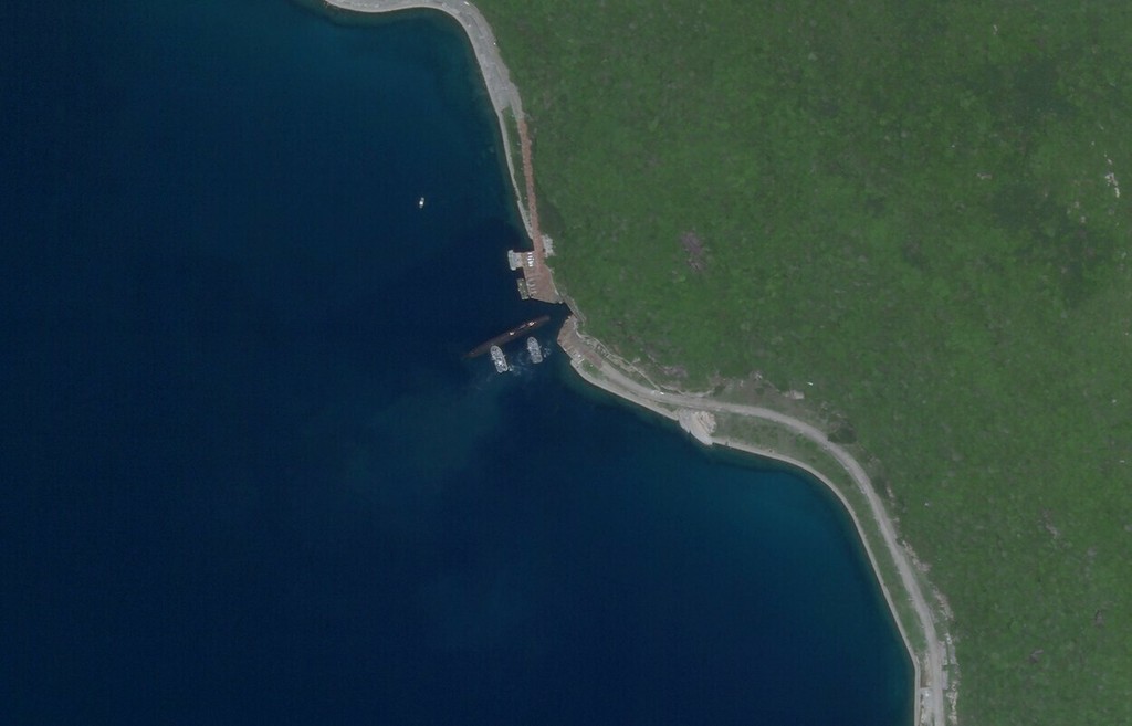 Na snímke sú vidieť aj dve ťažné lode, ktoré ponorku odťahujú na more.