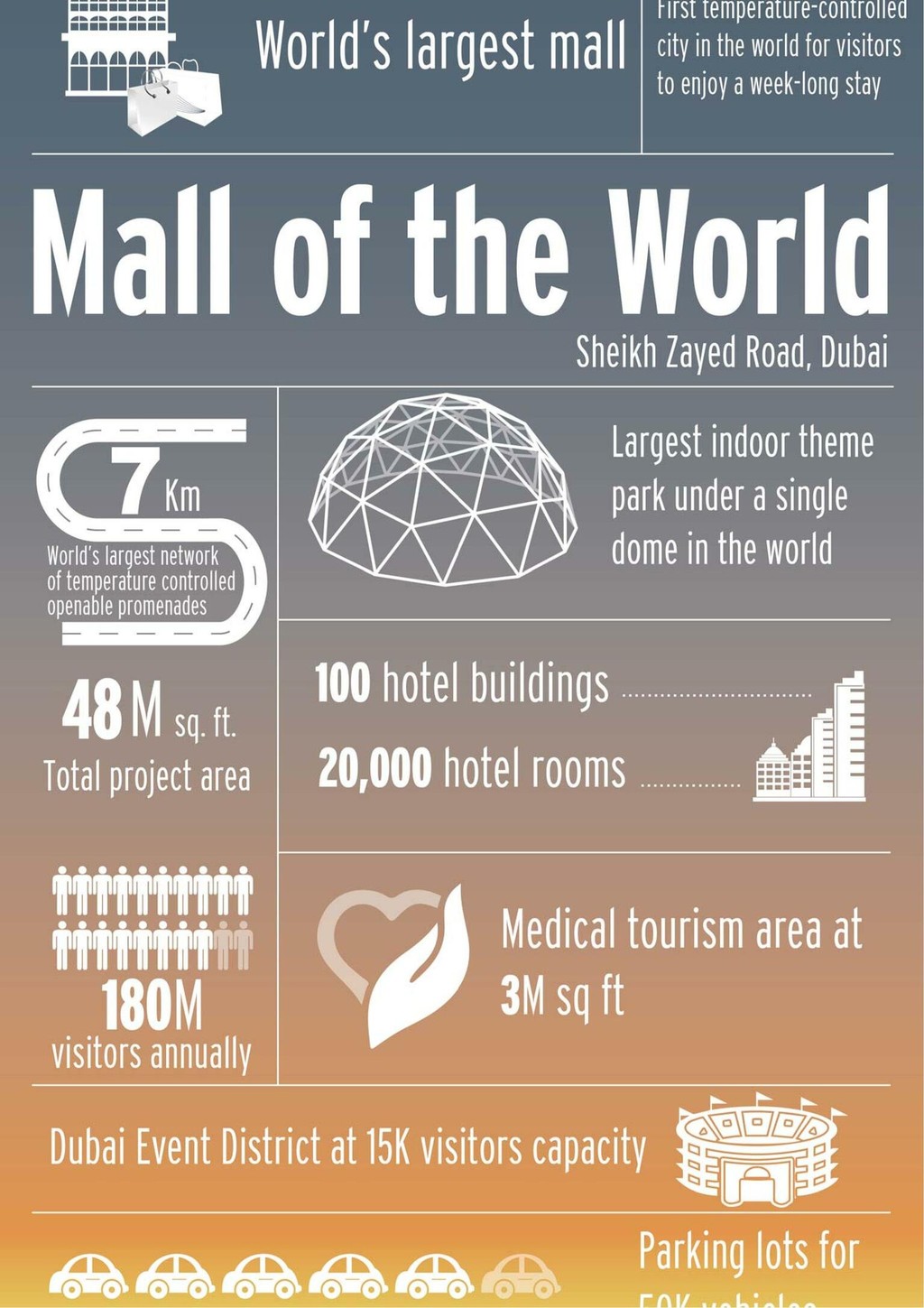 V klimatizovanom meste Mall of The World, v ktorom si sami budú určovať teplotu, nájdete všetko, čo potrebujete. Netradičné mesto by malo mať vyše štyroch miliónov metrov štvorcových (čo je rozloha malej slovenskej dediny). V meste nájdete úplne všetko od obchodného centra, cez zábavný park aj wellnes centrum.