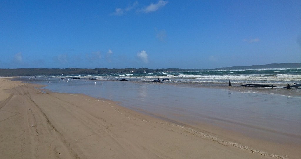 Záchranný tím námorných špecialistov zasahuje na odľahlej lokalite Macquarie Harbour. Veľryby - guľohlavce - uviazli na úzkej piesčine, spresnil tasmanský rezort. Podľa očitých svedkov však niekoľko veľrýb v plytkej vode medzitým uhynulo.