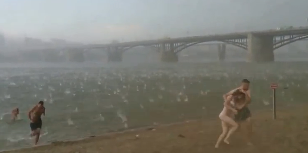 Šialená búrka zasiahla sibírsku pláž pri rieke Ob, keď teplomery ukazovali 37 stupňov Celzia. Dramatické video ukazuje, ako nikto z opaľujúcich ani netušil, že o pár sekúnd sa spustí obrovské krupobitie.
